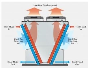 Hot process fluid enters the inlet header connection, shown in red. Heat from the fluid dissipates through the coil tubes surface to the fins. Ambient air is drawn in over the coil surface by the fan transfer to the air and discharge to the atmosphere. Cool process fluid exists.